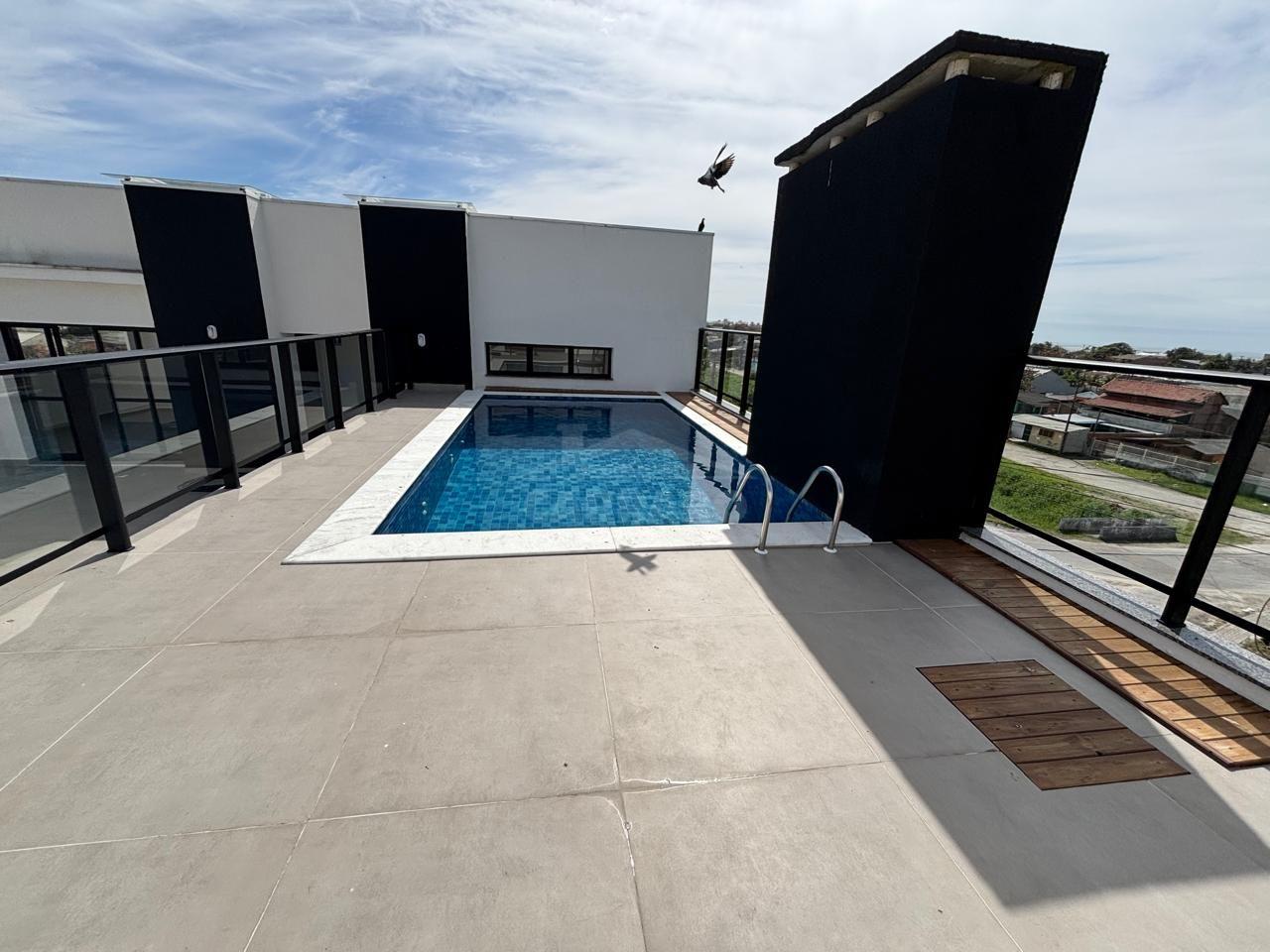 Salão de festa com churrasqueira, piscina e solário.